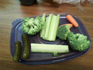 12:35 lunch time – 3oz (approx) baked salmon with cajon seasoning, 1 1/3c. (approx) brown rice with pepper strips (probably ~1/8c.) didn’t eat the clementines until later. also had the raw veggies shown below (carrots, broccoli, cucumber slice, celery, and some small pickles.