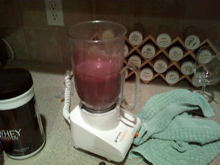 1c fat free plain yogurt, 1/2c silk soy milk (plain w/DHA), 1/2 scoop whey protein (chocolate), 1T dark cocoa powder, 1 1/3c. frozen mixed berries (blueberry, strawberry, raspberry, blackberry), and 1 1/2T peanut butter.