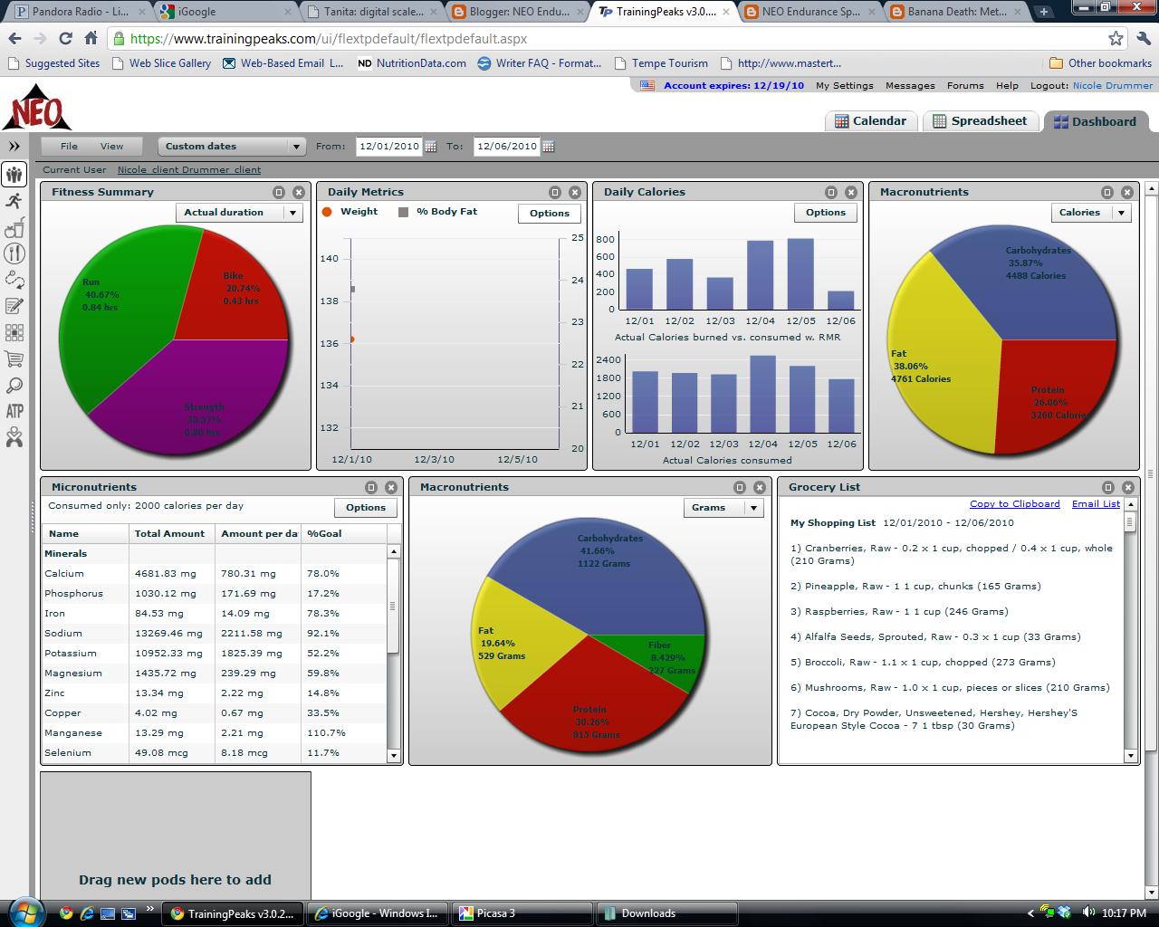 So let’s look at the numbers. TrainingPeaks.com has an easy to use nutrition tracking interface that I found gives me good information for this study. I can then pull a summary for a range of dates and look at many different metrics in a nice graphical view. The “pods” I display are chosen from several options and are customizable. Let’s take a look: